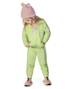 O conjunto é confeccionado em moletom flanelado, com capuz, zíper frontal e bolso canguru.