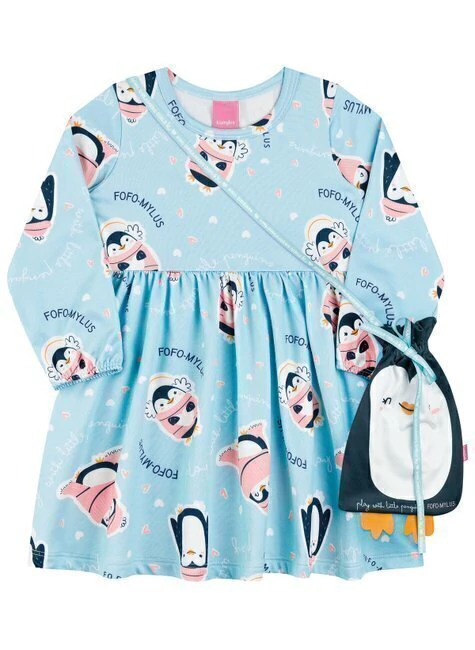 O vestido com estampa de pinguins vem acompanhado de uma charmosa bolsinha temática que vai encantar as pequenas. O modelo tem manga longa, cintura levemente marcada e saia com caimento soltinho. Acompanha uma bolsinha de ombro em formato de pinguim super divertida, feita em tecido com aplicação de patinhas e rostinho bordado.
